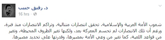 وأضاف حبيب فى تدوينة عبر صفحته على "فيس بوك": شعوب الأمة العربية والإسلامية، تحقق انتصارات متتالية، وتراكم الانتصارات منذ فترة، ورغم أن تلك الانتصارات لم تحسم المعركة بعد، ولكنها تغير الظروف المحيطة، وتغير من قواعد اللعبة، كما تغير من وعي الأمة بمصيرها، وقدرتها على تحديد مصيرها.