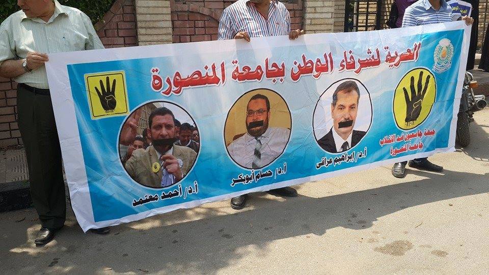 نظمت جبهة "جامعيون ضد الانقلاب" وقفةً أمام نادى أعضاء هيئة التدريس بجامعة المنصورة، للمطالبة بالإفراج عن زملائهم المعتقلين، كما أكدوا رفضهم لتعيين القيادات الجامعية، وحقهم فى اختيار من يمثلهم.