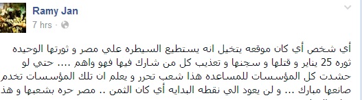 قال الناشط السياسي رامى جان، مؤسس حركة مسيحيون ضد الانقلاب، إنه لن يستطيع أى شخص مهما كان موقعه السيطرة على مصر وثورتها...
