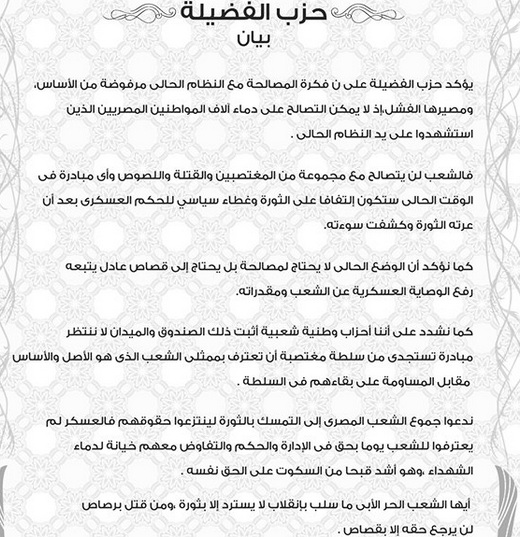 أكد حزب الفضيلة أن فكرة المصالحة مع النظام الحالي مرفوضة من الأساس، ومصيرها الفشل؛ "إذ لا يمكن التصالح على دماء آلاف المواطنين المصريين الذين استشهدوا على يد النظام الحالي".
