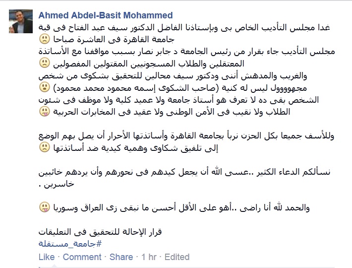 وتابع: للأسف جميعا بكل الحزن نربأ بجامعة القاهرة وأساتذتها اﻷحرار أن يصل بهم الوضع إلى تلفيق شكاوى وهمية كيدية ضد أساتذتها