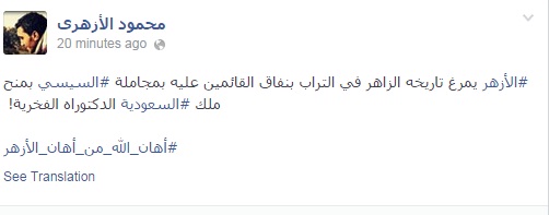 انتقد محمود الأزهرى المتحدث الرسمى باسم حركة طلاب ضد الانقلاب بجامعة الأزهر، منح الجامعة درجة الدكتوراه الفخرية لخادم الحرمين الشريفين الملك عبدالله بن عبد العزيز، واصفًا ما حدث بأنه "تمريغ لتراث الأزهر فى التراب".
