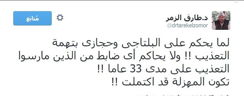 وقال الزمر في تغريدة عبر صفحته الرسمية على موقع التواصل الاجتماعي "تويتر": "لما يحكم على البلتاجي وحجازي بتهمة التعذيب!! ولا يحاكم أي ضابط من الذين مارسوا التعذيب على مدى 33 عامًا!!، تكون المهزلة قد اكتملت!!".