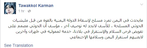 قالت الناشطة اليمنية توكل كرمان، الحاصلة على جائزة نوبل للسلام، إن "ما يحدث في اليمن تمرد مسلح لإسقاط الدولة اليمنية بالقوة من قبل مليشيات الحوثي المسلحة ، للأسف لا نجد له توصيف آخر".