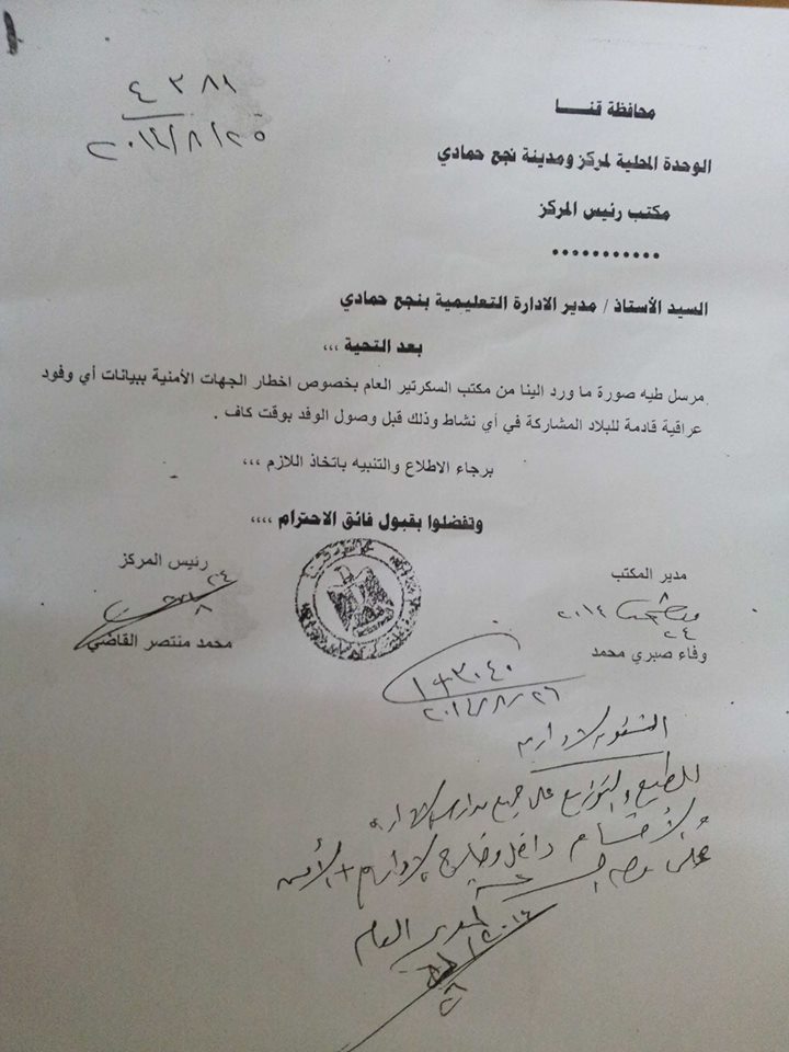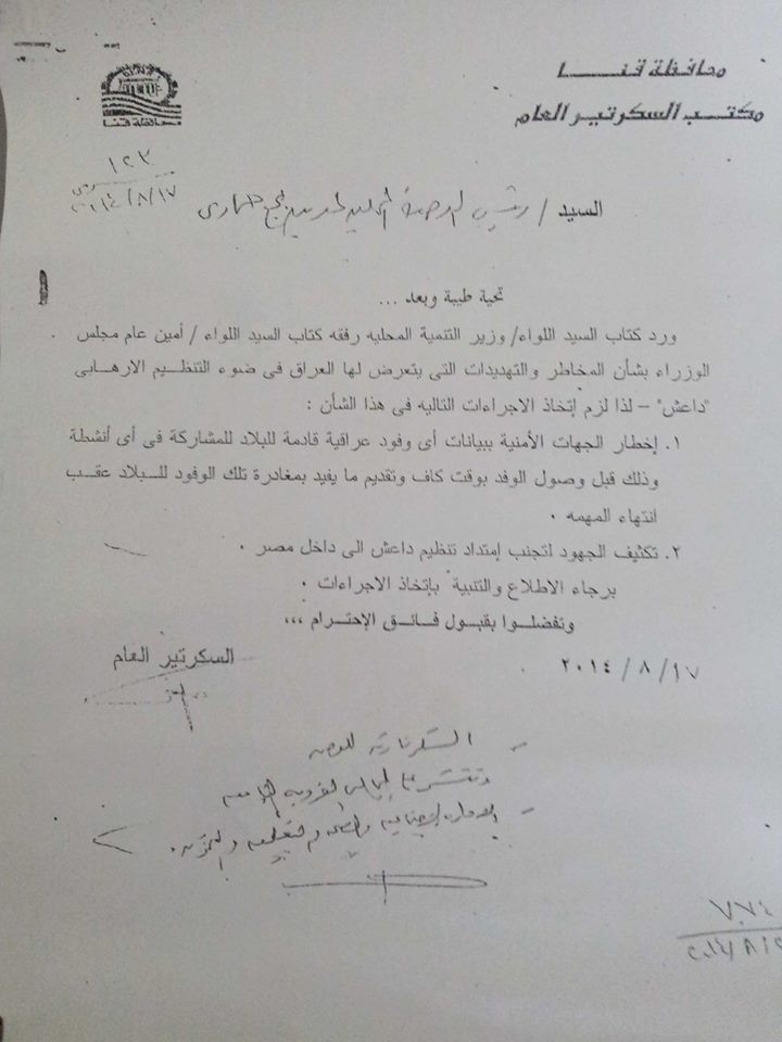 وورد في المنشور مايلي: "إخطار الجهات الأمنية ببيانات أية وفود عراقية قادمة للبلاد للمشاركة في أية أنشطة، وذلك قبل وصول الوفد بوقتٍ كاف، وتقديم ما يفيد مغادرة تلك الوفود للبلاد عقب انتهاء المهمة"، و"تكثيف الجهود لتجنب امتداد تنظيم داعش إلى داخل مصر" .