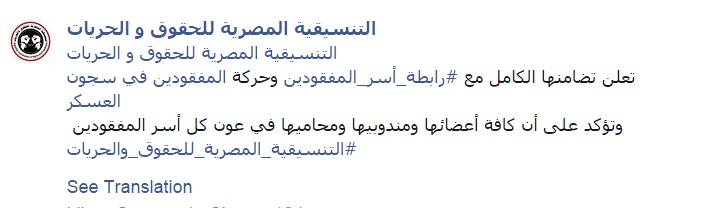 وأكدت التنسيقية في تدوينة للحركة عبر صفحتها على موقع التواصل الاجتماعي "فيس بوك"، أن كافة أعضائها ومندوبيها ومحاميها في عون كل أسر المفقودين.