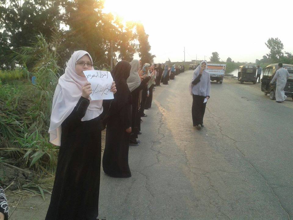 وفي نفس السياق نظمت حركة "نساء ضد الانقلاب" سلسلة بشرية في قرية"السنبلاويين"، نددت المشاركات باستمرار حبس فتيات المنصورة"منة، أبرار، يسرا"، كما نددن بالأحوال المعيشية المتردية، وغلاء الأسعار، والانقطاع المتكرر للكهرباء.