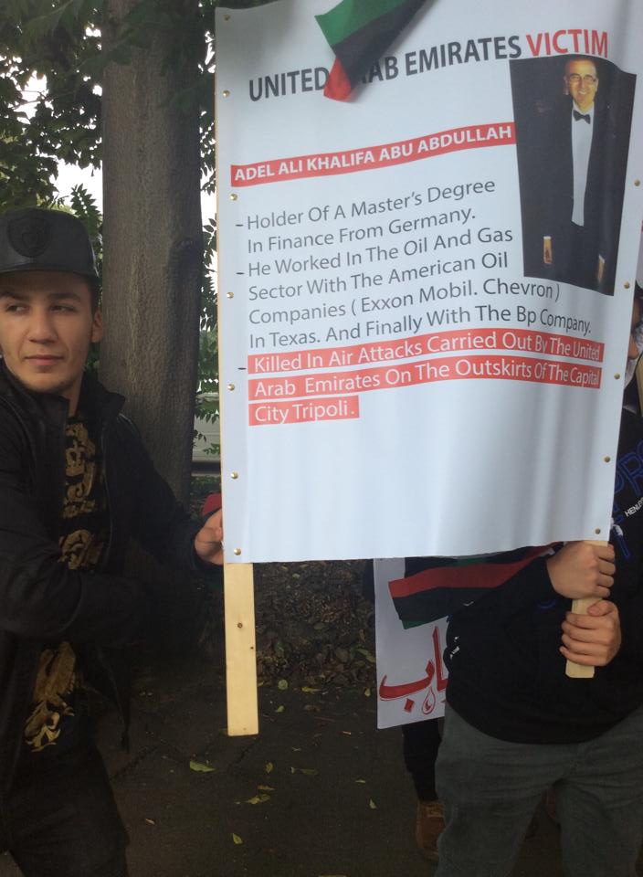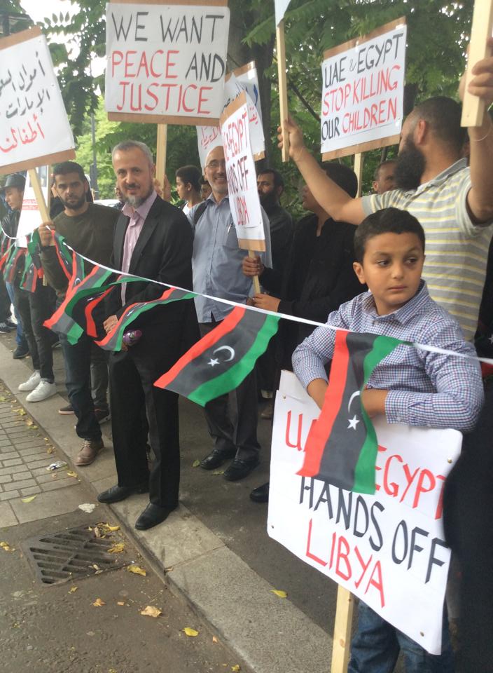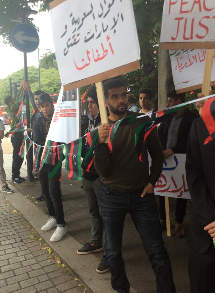 نظمت الجالية الليبية في لندن، وقفة احتجاجية أمام مقر السفارة الإماراتية، رفضًا للتدخل الإماراتي في الشأن الليبي، وحمل المشاركون لافتات كتب عليها: "الأموال السعودية والإمارات تقتل أطفالنا"، كما حملوا أعلام ليبيا.