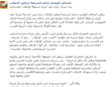 أعلن التحالف الوطني لدعم الشرعية ورفض الانقلاب رفضه لزيارة وزير خارجية أمريكا جون كيري لسلطة الانقلاب العسكري، مؤكدا أنها " لتوريط مصر في تحالف عسكري لخدمة الحلف الصهيوني أميركي في إنهاء معاركه التي لا طائل منها لمصر أو شعبها أو جيشها في ظل خلط الأوراق وتشويه ثورات الربيع العربي".
