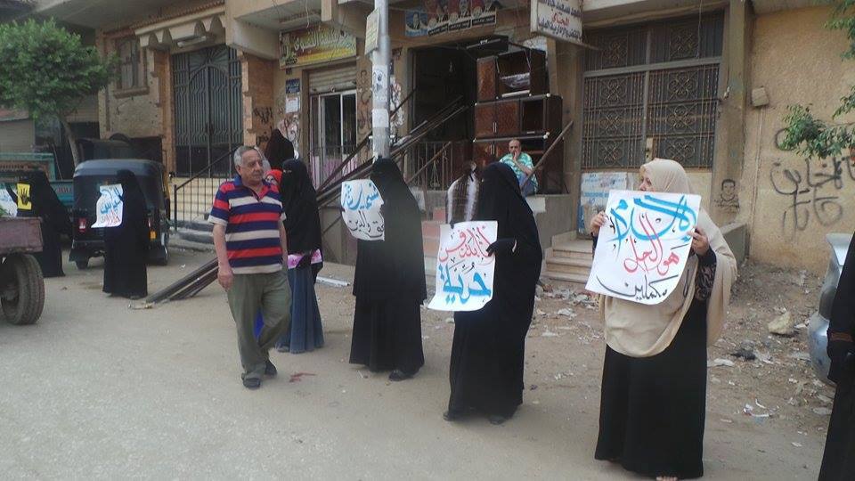 وحمل المشاركون شارات رابعة، وأعلام مصر، كما حملوا لافتات تندد بالانتهاكات التي تمارسها داخلية الانقلاب بحق المعارضين، كما طالبوا بسرعة الإفراج عن المعتقليين، والقصاص لدماء الشهداء.