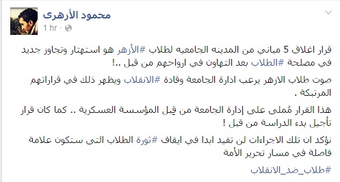 وأضاف الأزهري فى تدوينة عبر صفحته على "فيس بوك": "أن صوت طلاب الأزهر يرعب إدارة الجامعة وقادة الانقلاب ويظهر ذلك في قراراتهم المرتبكة"، مؤكدا أن "هذا القرار مُملى على إدارة الجامعة من قِبل المؤسسة العسكرية كما كان قرار تأجيل بدء الدراسة من قبل ".