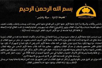 "بالتدليس والكذب والسرقة تبدأ إدارة جامعة الأزهر عامها الحالي و تختم فضائح عامها الماضي بعدما قتلت وسحلت واعتقلت وفصلت لتضيف لسجلها فضيحة جديدة بسرقة أصوات الطلاب وتزوير إرادتهم .