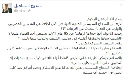 وقال إسماعيل في تدوينة عبر صفحته على " فيس بوك":" الإرهابي السفاح السيسى المتهم الأول فى قتل الآلاف من المدنيين المصريين والهارب من العدالة يتحدث عن الإرهاب ويتهم الإخوان أنها جماعة إرهابية من 85 عام ؟؟ولم يستطع أحد القضاء عليها ؟والشعب معاها وأعطاها أغلبية فى مجلس الشعب وانتخب منها رئيس ؟ يبقى الشعب المصري إرهابي ؟".
