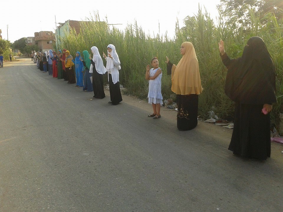 نظمت حركة "نساء ضد الانقلاب" بالغربية، سلسلة بشرية في قرية "شنراق" التابعة لمركز السنطة، رفع المشاركون فيها شارات رابعة، وصورًا للرئيس محمد مرسي، مطالبين بعودته.