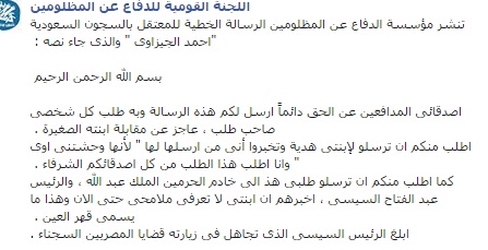 نشرت مؤسسة الدفاع عن المظلومين الرسالة الخطية للمعتقل بالسجون السعودية "احمد الجيزاوي " والذى جاء نصه كالتالى :