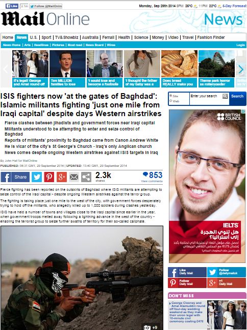 كشفت صحيفة "ديلي ميل" البريطانية، أنه بالرغم من القصف الأمريكي الدولي المكثف، واصل تنظيم الدولة الإسلامية "داعش" تمدده حتى تمكن  اليوم، من أن يكون على بعد 2 كيلو متر فقط من العاصمة العراقية بغداد.