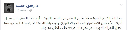 وأضاف حبيب في تدوينة عبر صفحته على موقع التواصل الاجتماعي "فيس بوك": "مع تزايد القمع الدموي قد يخرج البعض من الصف الثوري، أو يبحث البعض عن سبل أخرى، لأن ثمن الاستمرار في الحراك الثوري يكون باهظًا، وقد لا يتحمله البعض، مما يجعل الحراك الثوري يمر بمرحلة حرجة على الأقل معنويًا".