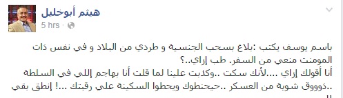 وقال أبو خليل فى تدوينة عبر صفحته على "فيس بوك": باسم يوسف يكتب :بلاغ بسحب الجنسية و طردي من البلاد و في نفس ذات المومنت منعي من السفر. طب إزاي..؟".