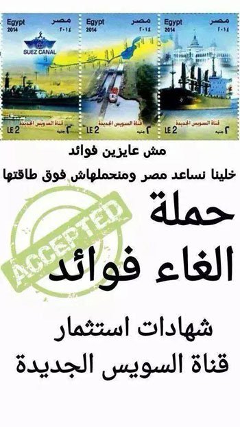 تصاعدت أصداء حملة لأنصار الانقلاب تطالب بإلغاء فوائد شهادات استثمار قناة السويس الجديدة، على مواقع التواصل الاجتماعي فيس بوك وتويتر؛ تعبيرًا عن حبهم لقائد الانقلاب، عبدالفتاح السيسي، وتضامنًا مع الوضع الاقتصادي الذي يمر به الوطن.
