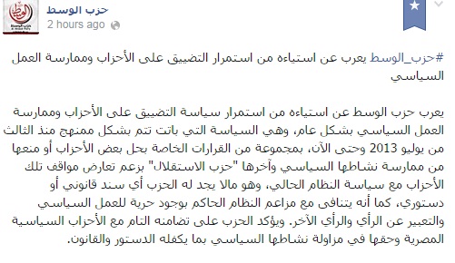 أعرب حزب الوسط عن استياءه من استمرار سياسة التضييق على الأحزاب وممارسة العمل السياسي بشكل عام، وهي السياسة التي باتت تتم بشكل ممنهج منذ الثالث من يوليو 2013 وحتى الآن، بمجموعة من القرارات الخاصة بحل بعض الأحزاب أو منعها من ممارسة نشاطها السياسي وآخرها "حزب الاستقلال" بزعم تعارض مواقف تلك الأحزاب مع سياسة النظام الحالي، وهو مالا يجد له الحزب أي سند قانوني أو دستوري، كما أنه يتنافى مع مزاعم النظام الحاكم بوجود حرية للعمل السياسي والتعبير عن الرأي والرأي الآخر.