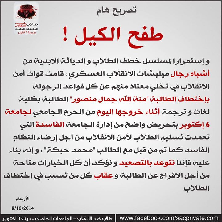 توعدت حركة طلاب ضد الانقلاب بجامعة 6 أكتوبر، خاطفي الطالبة "منة الله جمال منصور"، الطالبة بكلية لغات وترجمة، التي تم اختطافها، اليوم، من أمام الحرم الجامعي لجامعة 6 أكتوبر، واصفين ذلك بأنه تحريض من إدارة الجامعة، حيث توعدت الحركة عبر صفحتها الرسمية على فيس بوك بالتصعيد من خلال جميع الخيارات المتاحة أمامها .