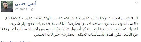 وأضاف حسن فى تدوينة عبر صفحته على موقع التواصل الاجتماعي "فيس بوك": لعبة شبيهة بلعبة تركيا تتكرر على حدود باكستان .. الهند تصعد على حدودها مع باكستان وتقصف قرى متاخمة .. والمعارضة الباكستانية تتحرك لدفع نواز شريف لتحرك غير محسوب هنالك".