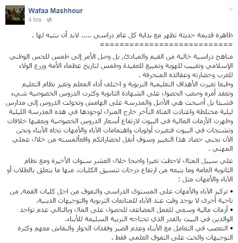 وأضافت مشهور فى تدوينة عبر صفحتها على موقع التواصل الاجتماعي "فيس بوك " تغيرت الأهداف التعليمية التربوية و اختلف أداء المعلم وتغير نظام التعليم وتعقد أمره وصعب الحصول على الشهادة الثانوية وكثرت الدروس الخصوصية شيء فشيئا بل أصبحت هي الأصل والمدرسة على الهامش وتحولت الدروس إلى مدارس ليلية مختلطة واعتادت الفتاة التأخر خارج المنزل لوجودها في هذه المدرسة الليلية وظهرت الأزمات المالية في البيوت لارتفاع أسعار الدروس الخصوصية ويعقبها خلافات وتشنجات في البيوت فتغيرت أولويات واهتمامات الآباء والأمهات تجاه الأبناء ونحن الآن نجني حصاد هذا التغيير وسوف أنقل لحضاراتكم واقع ألمسته من خلال عملي المهني ".