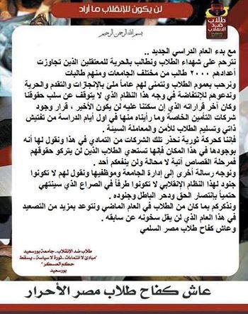 و قال البيان "إنه مع بدء العام الدراسي الجديد نترحم علي شهداء الطلاب و نطالب الحرية للمعتقلين الذين تجاوزت أعدادهم 2000 طالب في مختلف الجامعات ومنهم طالبات ونرحب بعموم الطلاب و نتمنى لهم عاماً  ملئ بالإنجازات و التقدم و الحرية"