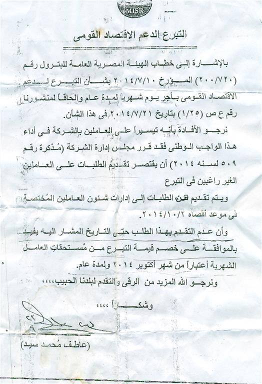 قامت الهيئة المصرية للبترول بإصدار منشور تم توزيعه في فرع الهيئة بأسوان، يطلب من موظفي الهيئة الذين لا يرغبون في التبرع لصندوق "تحيا مصر"، بتقديم طلب للهيئة يفيد بعدم رغبتهم في التبرع، والموظف الذي لا يتقدم بهذا الطلب يعتبر موافقًا ضمنيًا على خصم نسبة من راتبه.