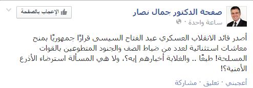 وفي إطار ذلك قال جمال نصار – الباحث والمحلل السياسي – إن إصدار قائد الانقلاب العسكري عبد الفتاح السيسى قرارًا جمهوريًا بمنح معاشات استثنائية لعدد من ضباط الصف والجنود المتطوعين بالقوات المسلحة.. استرضاء للأذرع الأمنية.