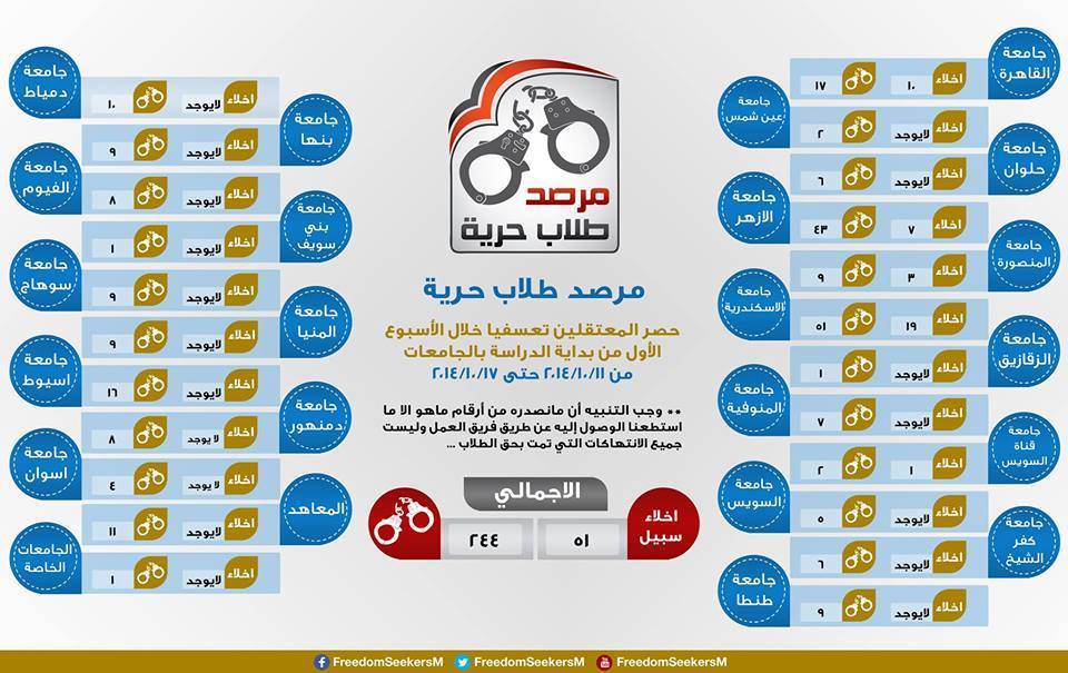 وبحسب "المرصد"؛ بلغ إجمالي عدد الطلاب المعتقلين منذ فجر يوم السبت 11-10-2014 وحتى يوم الجمعة 17-10-2014 إلى (244) معتقلًا ؛ تم إخلاء سبيل ( 51 ) طالبًا منهم، وجاءت الإحصائية كالتالي: