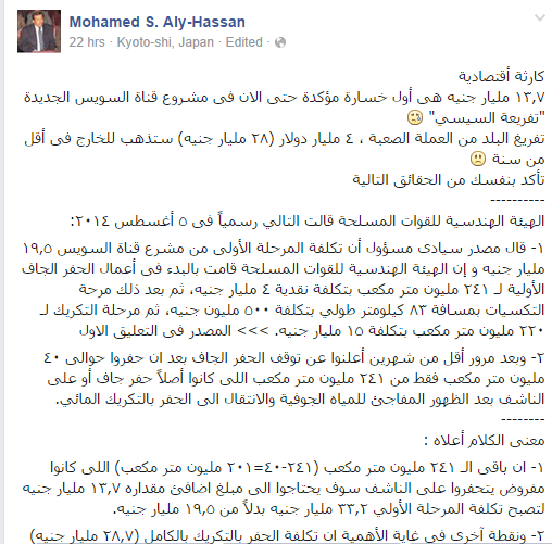 ونقل حسن عبر صفحته الشخصية علي الفيسبوك تصرحات الهيئة الهندسية للقوات المسلحة والتي قالت فى ٥ أغسطس ٢٠١٤حسب تصريحات مصدر سيادى مسؤول بها أن تكلفة المرحلة الأولى من مشرع قناة السويس ١٩,٥ مليار جنيه و إن الهيئة الهندسية للقوات المسلحة قامت بالبدء فى أعمال الحفر الجاف الأولية لـ ٢٤١ مليون متر مكعب بتكلفة نقدية ٤ مليار جنيه، ثم بعد ذلك مرحة التكسيات بمسافة ٨٣ كيلومتر طولي بتكلفة ٥٠٠ مليون جنيه، ثم مرحلة التكريك لـ ٢٢٠ مليون متر مكعب بتكلفة ١٥ مليار جنيه. المصدر فى التعليق الرابع