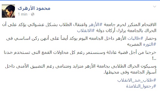 قال محمود الأزهري المتحدث الرسمي باسم طلاب ضد الانقلاب بجامعة الأزهر إن " الاقتحام المتكرر لحرم جامعة الأزهر واعتقال الطلاب بشكل عشوائي يؤكد على أن الحراك بالجامعة يزلزل أركان دولة الانقلاب".