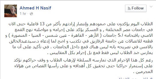 قال أحمد ناصف المتحدث باسم طلاب ضد الانقلاب"إن الطلاب اليوم يؤكدون صمودهم ضد اعتداءات مليشيات الانقلاب العسكري بأكثر من 13 فعالية، رغم اقتحامها لـ 5 جامعات" الأزهر – القاهرة – عين شمس – المنيا – المنصورة، وقطع للاتصالات عن جامعة الزقازيق في تكذيب واضح لما ادعاه د.سيدعبد الخالق، وزير التعليم العالي في حكومة الانقلاب بالأمس في تصريحه بأنه ليس هناك قمع داخل الجامعات."