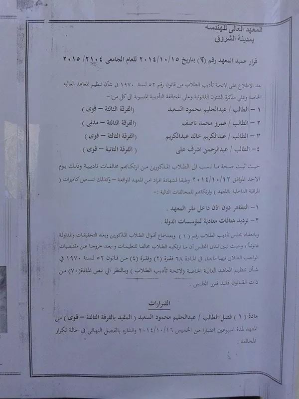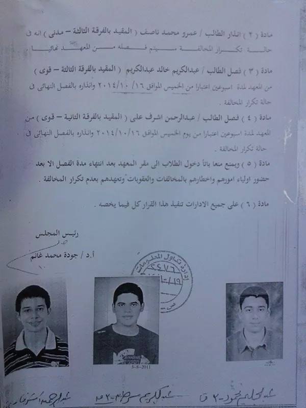 والمفصولون هم " عبد الحليم محمود السعيد – الفرقة الثالثة – قوى ، عبد الكريم خالد عبد الكريم – الفرقة الثالثة – قوى ، عبد الرحمن أشرف علي – الفرقة الثانية – قوى"، وإنذار للطالب "عمرو محمد ناصف – الفرقة الثالثة – مدني". وتم فصل الطلاب أسبوعين اعتبارًا من يوم 16 – 10 -2014 ومنعهم من دخول حرم الكلية ، وتهديد الرابع بالفصل إذا عاود تكرار مخالفة.