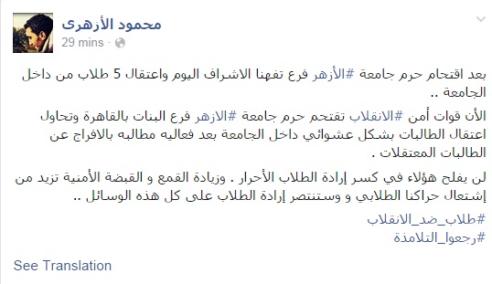 وقال الأزهري في تدوينة عبر صفحته على موقع التواصل الاجتماعي "فيس بوك": "بعد اقتحام حرم جامعة الأزهر فرع تفهنا الأشراف اليوم واعتقال 5 طلاب من داخل الجامعة .. الآن قوات أمن الانقلاب تقتحم حرم جامعة الأزهر فرع البنات بالقاهرة وتحاول اعتقال الطالبات بشكل عشوائي داخل الجامعة بعد فعالية مطالبة بالإفراج عن الطالبات المعتقلات".