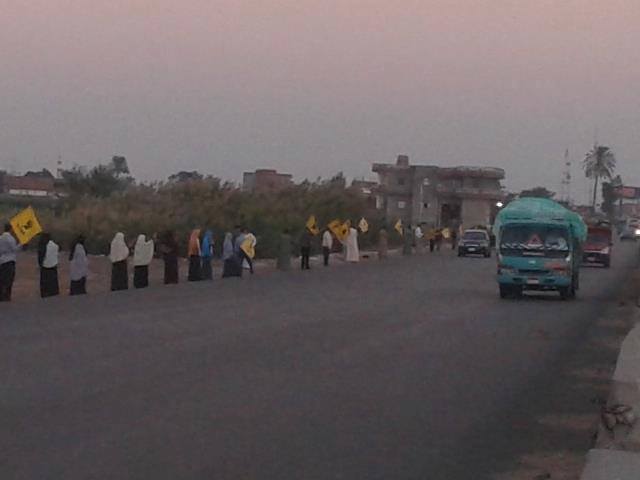 رفع المشاركون فى السلسلة شارات رابعة، ولافتات تندد بالأوضاع الاقتصادية المتردية، وغلاء الأسعار، فيما أكدوا على استمرار تظاهراتهم المناهضة للانقلاب حتى إسقاطه.