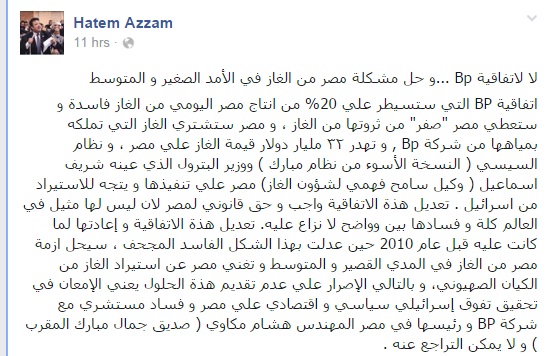 وقال عزام في تدوينة عبر صفحته على موقع التواصل الاجتماعي "فيس بوك": "نظام السيسي (النسخة الأسوأ من نظام مبارك)، ووزير البترول الذي عينه شريف إسماعيل (وكيل سامح فهمي لشئون الغاز) مصر على تنفيذها، ويتجه للاستيراد من إسرائيل".