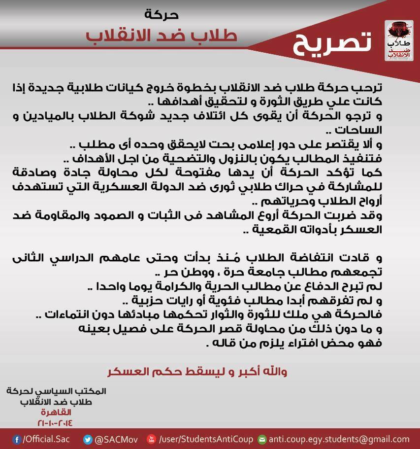 كما أكدت الحركة أن يدها مفتوحة لكل محاولة جادة وصادقة للمشاركة في حراك طلابي ثورى ضد الدولة العسكرية التي تستهدف أرواح الطلاب وحرياتهم.