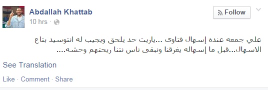 وأضاف خطاب في تدوينة عبر صفحته الرسمية على موقع التواصل الاجتماعي "فيس بوك": "يا ريت حد يلحق ويجيب له انتوسيد بتاع الإسهال.. قبل ما إسهاله يغرقنا ونبقى ناس نتنة ريحتهم وحشة".
