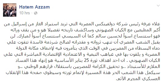 وأضاف عزام في تدوينة عبر صفحته على موقع التواصل الاجتماعي "فيس بوك": " لن يقبل الشعب المصري أن تنهب ثرواته و مقدراته، لصالح شرذمة فاسدة تتقوت علي دماء البسطاء من المصريين، في الوقت الذي يتآمرون فيه لإضعاف مكانة الدولة المصرية، و يلقون بها في غياهب التبعية والاعتمادية الاقتصادية المباشرة التي على الكيان الصهيوني".