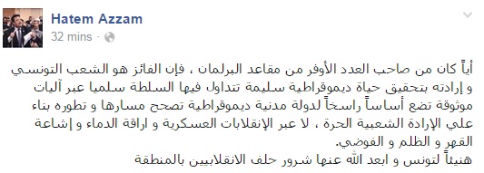 وقال عزام في تدوينة عبر صفحته على موقع التواصل الاجتماعي "فيس بوك": "أياً كان من صاحب العدد الأوفر من مقاعد البرلمان، فإن الفائز هو الشعب التونسي وإرادته بتحقيق حياة ديمقراطية سليمة، تتداول فيها السلطة سلميا عبر آليات موثوقة، تضع أساساً راسخاً لدولة مدنية ديمقراطية، تصحح مسارها و تطوره بناء علي الإرادة الشعبية الحرة".