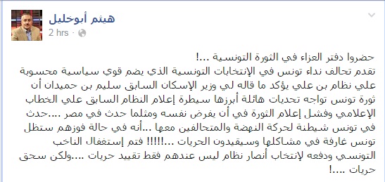 وقال أبوخليل في تدوينة عبر صفحته على موقع التواصل الاجتماعي "فيس بوك": "إن تقدم تحالف نداء تونس في الانتخابات التونسية الذي يضم قوي سياسية محسوبة علي نظام بن علي؛ يؤكد ما قاله لي وزير الإسكان السابق سليم بن حميدان أن ثورة تونس تواجه تحديات هائلة، أبرزها سيطرة إعلام النظام السابق علي الخطاب الإعلامي، وفشل إعلام الثورة في أن يفرض نفسه".