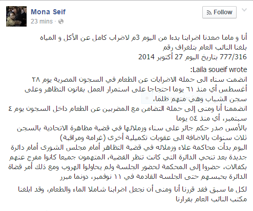 صرحت الناشطة السياسية والحقوقية "منى سيف"، بدخولها هي ووالدتها "ليلى سويف"، في إضرابٍ مفتوحٍ عن الطعام والشراب، فيما أكدتا تقدمهما ببلاغ للنائب العام 777/316 ،اليوم الإثنين، وذلك عقب إضرابهن الجزئي في ٤ من سبتمبر الماضي.