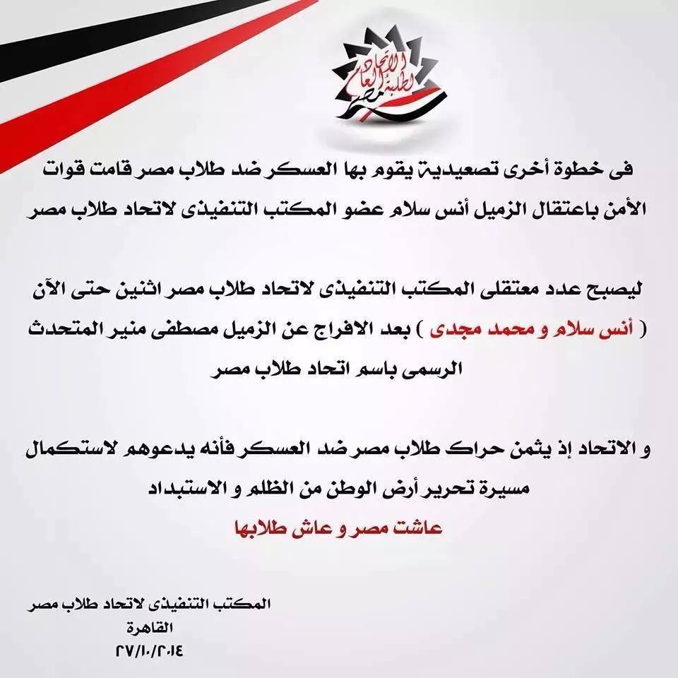 أصدر المكتب التنفيذي لاتحاد طلاب مصر، بيانًا، يندد فيه بممارسات أمن الانقلاب، والقمع الأمني بحق الطلاب، خاصةً بعد اعتقال الطالب "أنس سلام" – عضو المكتب التنفيذي لاتحاد طلاب مصر.