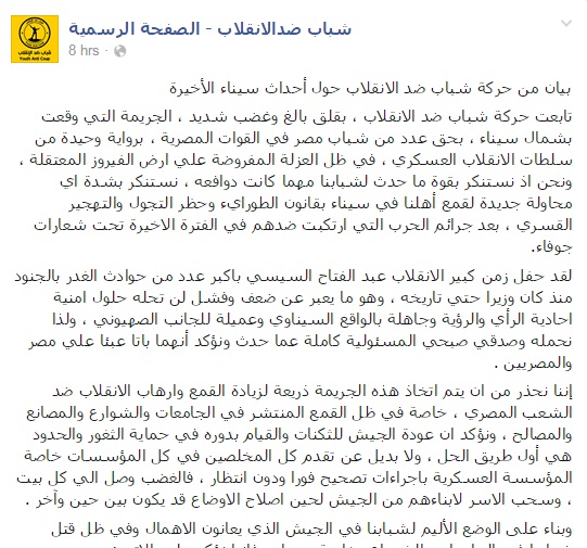 وحذرت الحركة من "اتخاذ هذه الجريمة ذريعة لزيادة القمع وإرهاب الانقلاب ضد الشعب المصري، خاصة في ظل القمع المنتشر في الجامعات والشوارع والمصانع والمصالح، مؤكدة أن عودة الجيش للثكنات والقيام بدوره في حماية الثغور والحدود هي أول طريق الحل، ولا بديل عن تقدم كل المخلصين في كل المؤسسات خاصة المؤسسة العسكرية بإجراءات تصحيح فورا ودون انتظار، فالغضب وصل إلي كل بيت، وسحب الأسر لابناءهم من الجيش لحين إصلاح الأوضاع قد يكون بين حين وآخر".