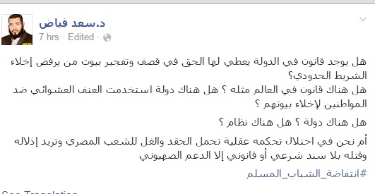 وقال فياض في تدوينة عبر صفحته على موقع التواصل الاجتماعي "فيس بوك": "ما يحدث في سيناء أسوأ مما فعله الاحتلال الصهيوني بالفلسطينيين، والعقلية التي تحركه هي عقلية نازية تنطلق من فكرة الإبادة الجماعية لكل من يقف أمام السلطة الخادمة للمشروع الصهيوني، والمعادية لغزة أكثر من الاحتلال ذات نفسه لها".