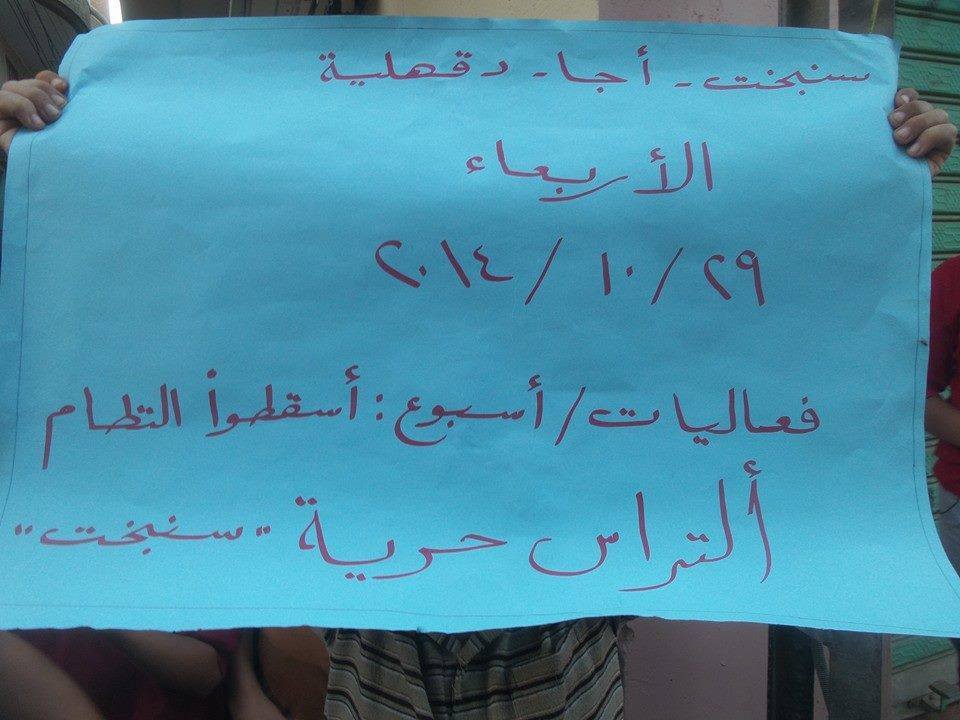 نظم "أولتراس حرية" في الدقهلية، اليوم، بالمشاركة مع حركة "صوت الحرة"، وقفة حاشدة، بقرية ‫سنبخت‬ التابعه لمركز ‫أجا،‬ حملوا خلالها لافتات تندد بالأوضاع الاقتصادية المتردية، وغلاء الأسعار.