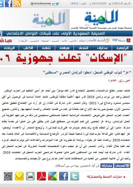 وبحسب جريدة المدينة، كشف مصدر مطلع  تفاصيل الاجتماع الذي عقد مؤخرًا بين أحمد عز – أمين التنظيم في الحزب الوطني المنحل – وعدد من نواب برلمان 2010 الذي شهد أغلبية مطلقة للوطني (المنحل)، كانت عاملاً أساسيًا في الوصول إلى أفق سياسي مسدود واندلاع ثورة 2011.