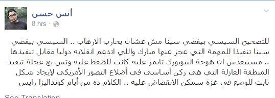 وقال "حسن" في تدوينة عبر صفحته على موقع التواصل الاجتماعي "فيس بوك": "للتصحيح، السيسي بيفضي سينا مش عشان يحارب الإرهاب، السيسي بيفضي سينا تنفيذًا للمهمة التي عجز عنها مبارك، واللي اتدعم انقلابه دوليًا مقابل تنفيذها".